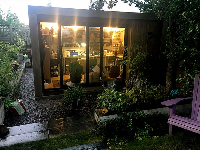 My new space is down at the bottom of our garden and it’s completely self-contained. It’s what they call a ‘garden room’, basically a posh shed, 4 metres by 5 metres, put up by a company called Green Retreats. The best thing about it is that it’s very well insulated; even when the weather is freezing, it still feels warm inside.