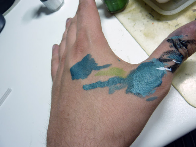 Let me try to explain – as i am always thinning my colours with water i found out for myself that i don’t want to look away from the miniature while working when i have to clean the brush on a tissue. So i have started to use my thumb of the hand holding the miniature. So i have no time loss, haha. Additional to this i feel how the glazes will work on the miniature when i bring them on. You can feel the condition of your colour through your skin. I do this now for several years, my thumb is still there – you can clean it easily with warm water and soap. I am not sure if this is healthy, so please if you are scared don’t do it. Attention while using colours that are not based on water, like Tamyias or other evil smelling stuff – i am not using this method with dangerous colours. Choose for yourself and try if you like it – i couldn’t paint without anymore…
